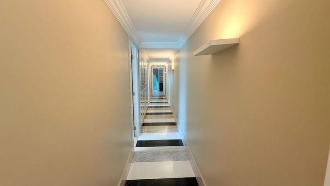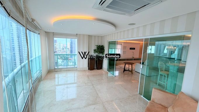 Apartamento com 250m² privativos, em andar alto, com fino acabamento em mármore, amplas salas integradas e sacada climatizada.